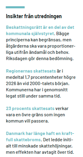 ”Belägg för broms?” är den lite vitsiga titeln på luntan som Annika Wallenskog, SKR:s förra chefsekonom, lämnade över till civilminister Erik Slottner den 4 mars. Frågetecknet är viktigt, för utredningen svarar inte själv ja eller nej på frågan om det är rimligt att staten tar en avgift av en kommun eller region som höjer skatten och omvänt ger en premie om skatten istället sänks.
